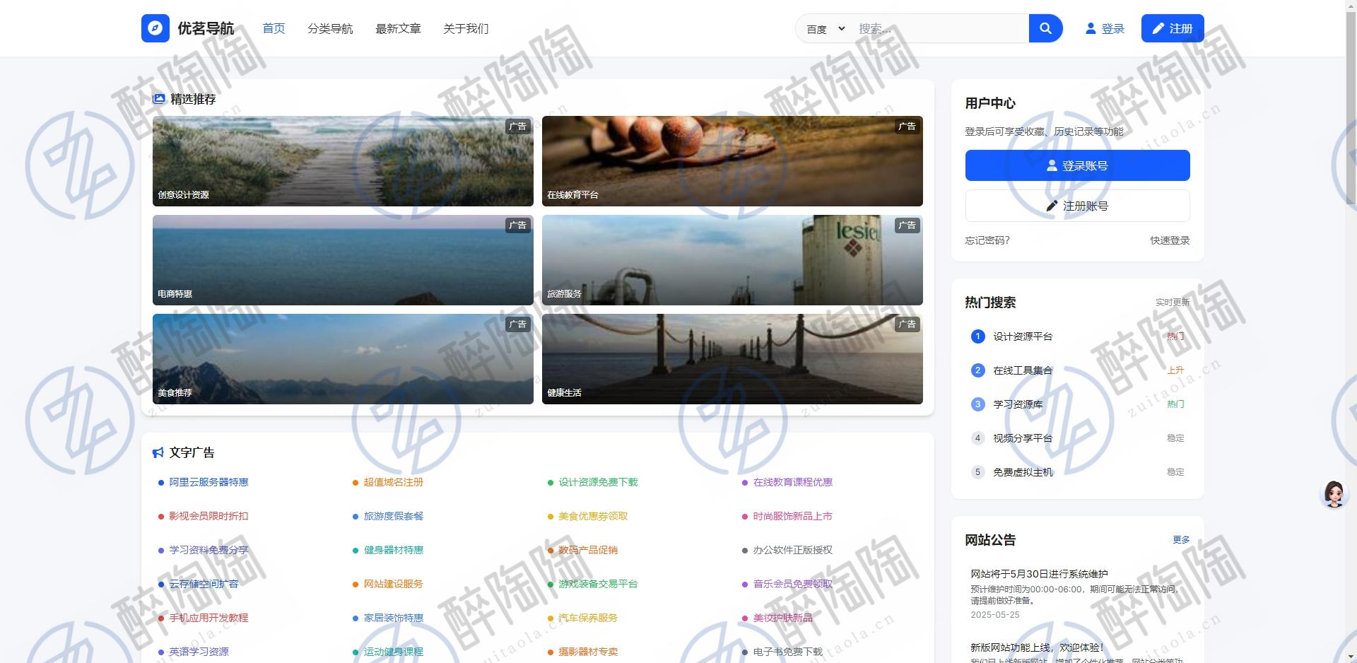 文章 资源分享 优茗导航系统源码模版,主打一个学习为主 最陶陶科技作者 2025年9月25日 0 评论 61 阅读   首页 › 资源分享 ›正文 官方 直接修改HTML文件内容即可! 演示图: 资源下载抱歉,下载地址 评论 后刷新可见 版权说明 文章采用: 《署名-非商业性使用-相同方式共享 4.0 国际 (CC BY-NC-SA 4.0)》许可协议授权。版权声明:未标注转载均为本站原创,转载时请以链接形式注明文章出处。如有侵权、不妥之处,请联系站长删除。敬请谅解!